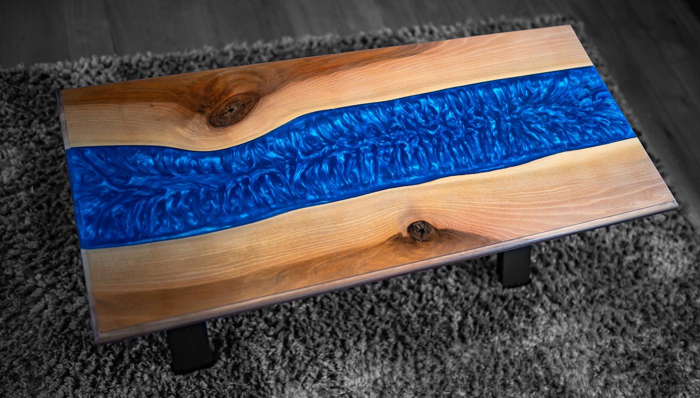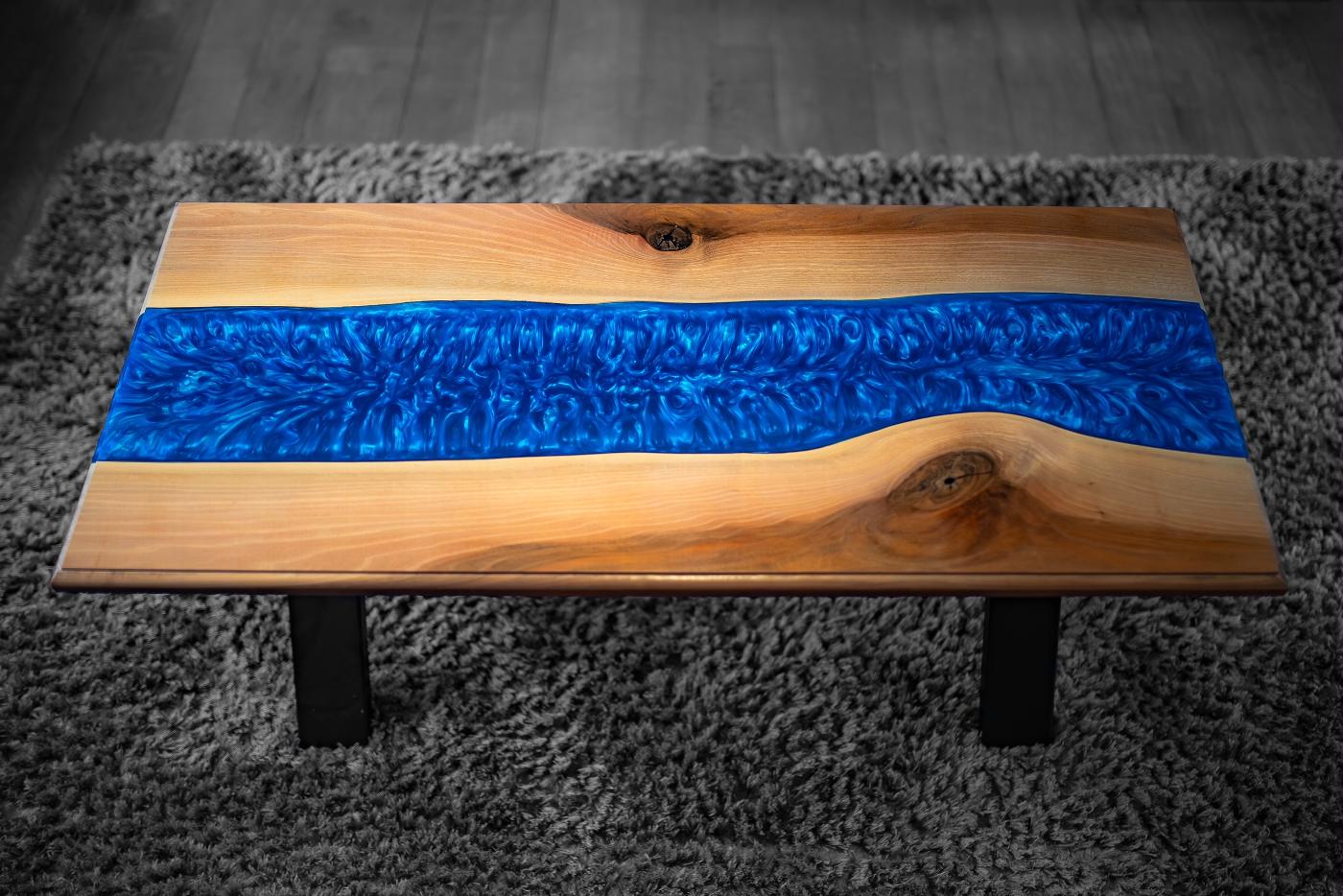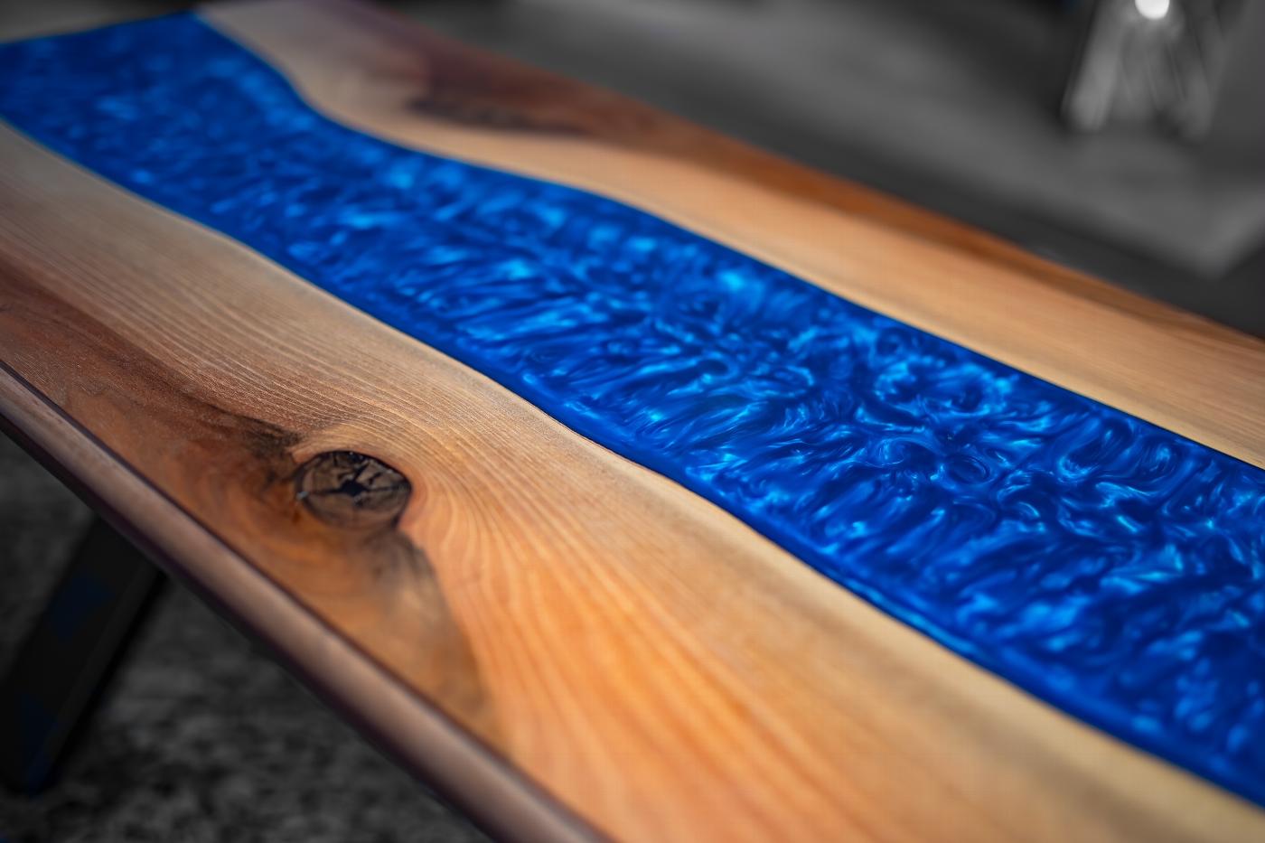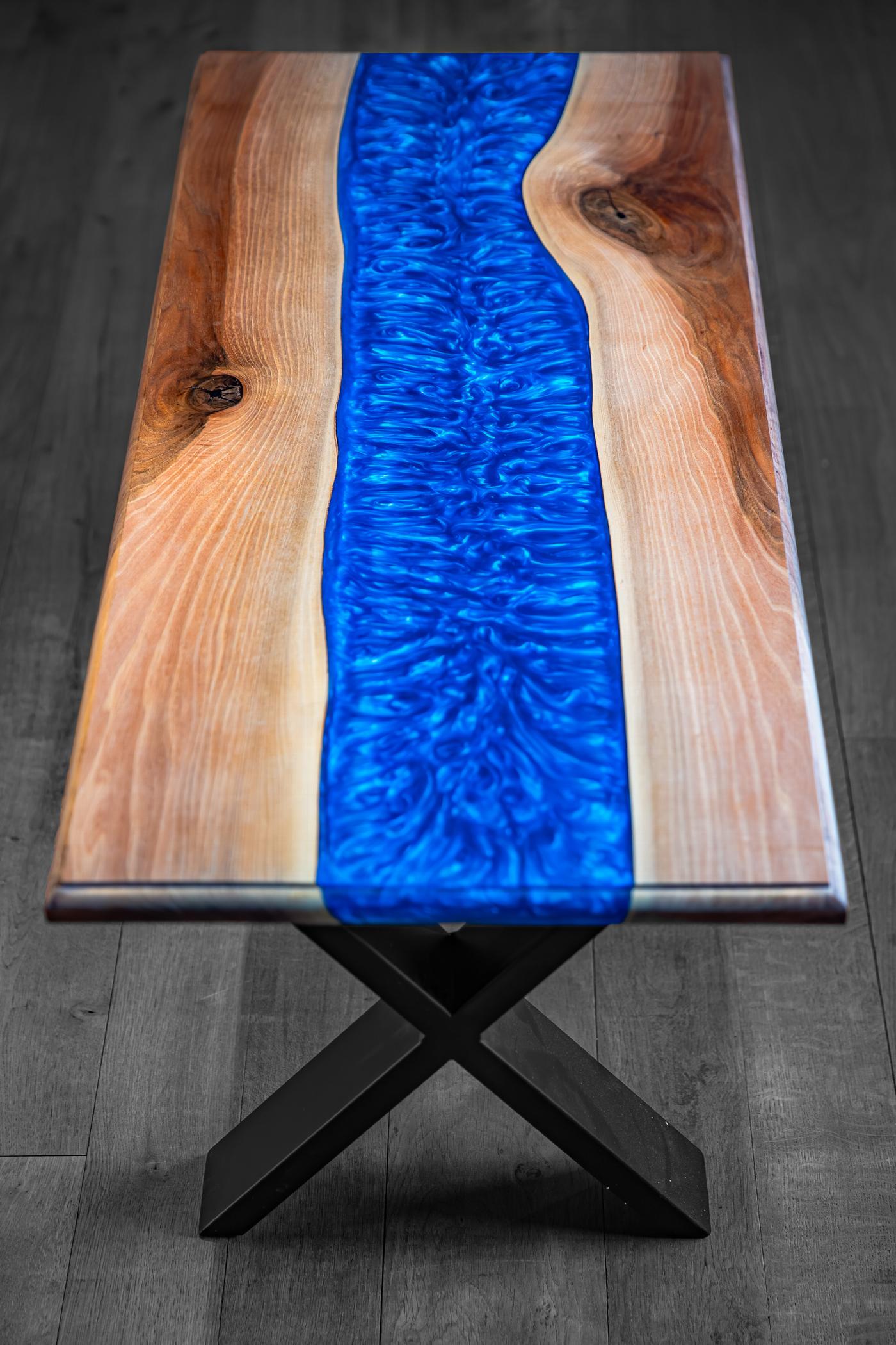It has a metallic blue epoxy resin river finished to a high gloss. It comes with black powder coated ‘X’ legs.